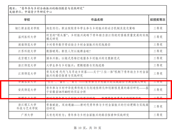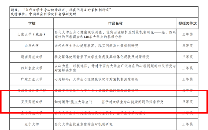 近日,由共青团中央、中国科协、教育部、中国社科院、全国学联联合主办的第十九届“挑战杯”全国大学生课外学术科技作品竞赛2024年度“揭榜挂帅”专项赛终审决赛落下帷幕,太阳集团tcy8722《青年参与乡村中华优秀传统文化创造性转化和创新性发展的路径研究——基于安徽省16市40村的实证分析》《如何消除“脆皮大学生”——基于对大学生身心健康问题的探索研究》2项作品荣获全国三等奖。
