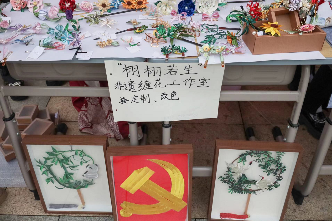 “这边是纯手工缠花饰品,可以挑选购买也可以拍照打卡!”上午10点,学前教育专业2020(3)班的郭玉洁团队就已经将要出售的物件准备好。介绍缠花文化、讲解制作方法、进行饰品搭配,面对每一位前来询问的顾客,郭玉洁都耐心作出解答。