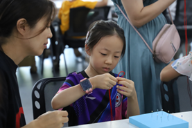 插针、排线、抽线……在中国结的教学课堂上,实践团的成员们向家长与孩子们介绍了中国结的历史,并进行了示范教学。他们穿梭在各处,带领学生们编织出一件件二回盘长结。“无论是排线还是抽线,都需要耐心与细心。”这是还在上小学的程悦然第一次接触中国结。程悦然的妈妈表示,希望类似的活动能够继续办下去。