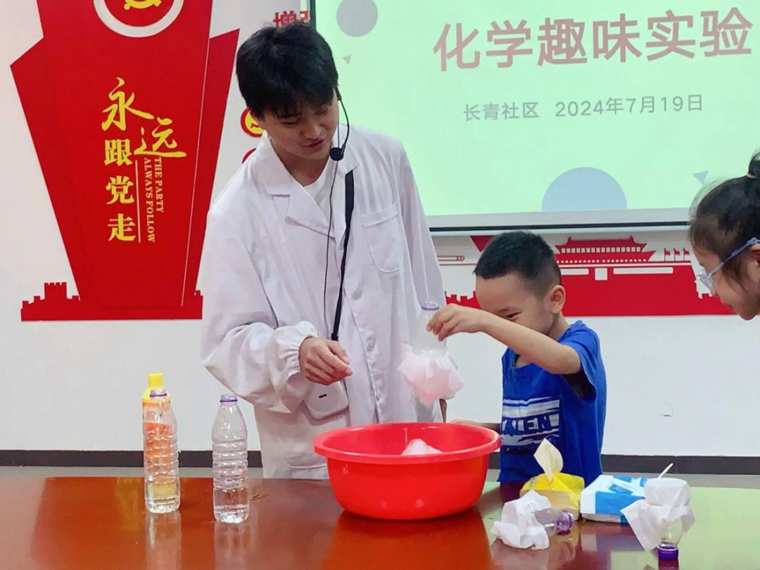 当奇妙有趣的化学实验遇上小朋友们会有怎样的“化学反应”呢?“小朋友快看,是不是有很多彩色泡沫喷涌而出,这就是小苏打和白醋发生了剧烈的化学反应。”团队成员化学工程与工艺专业2022级(1)班的李杨向小朋友们介绍冰淇淋火山实验。