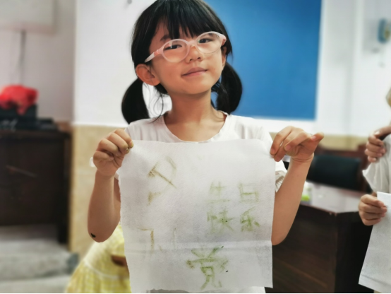 创新学习渠道,志愿者将拓染技术带进课堂,让学生自己动手,发挥思维,忆苦思甜,体会革命精神。多数同学更是拓染出党徽及“7.1党生日快乐”等花纹字样,表达自己对党和国家的敬爱之情。