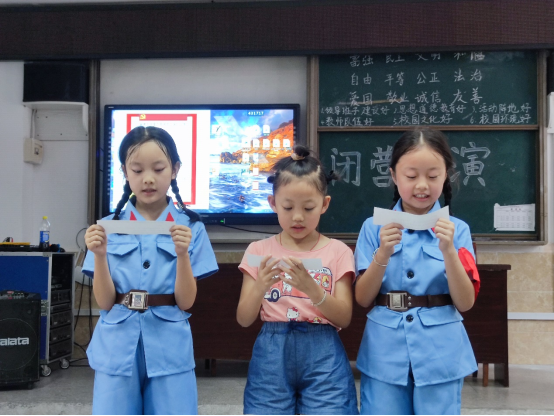 实践团志愿者引导依泽小学学生知史爱党、知史爱国,厚植爱党、爱国、爱社会主义精神。“举办这样的活动,目的是引导孩子们通过书画的形式讴歌党百年奋斗的光辉历程,增强学生爱党、爱国情感。”对于今天的活动,实践团队长袁浩这样总结了活动意义。时间在不经意间溜走,本次夏令营活动最终在十二名留守儿童合唱《听我说谢谢你》中结束。“短短七天,可能并没有传授很多知识,但我们拓宽了学生的视野,为他们树立正确价值观,教会他们积极面对生活,带给他们希望与梦想,我们也感受到了每一个小朋友的成长。”实践团团长袁浩表示,“七天支教生活带给志愿者无限感动,我们在实践中体会志愿精神的责任与使命,树立至诚至坚的理想信念”(撰稿:钱逢春 刘梦婷 宋琪 摄影:凌康洁 赵煜坤 黄雨菲 刘鹏伟 审核:刘燕杰)