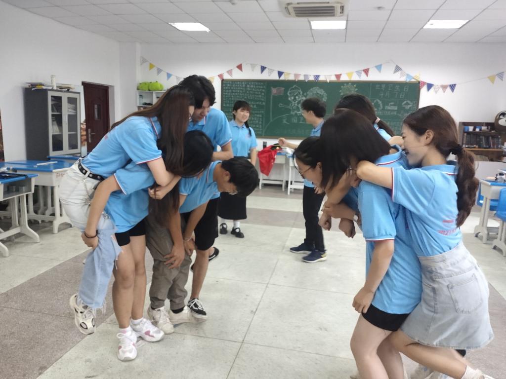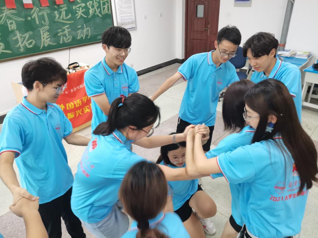 互赞小游戏、应答自如、坐地起身……7月11日,实践团在外国语学院楼举办素质拓展活动。