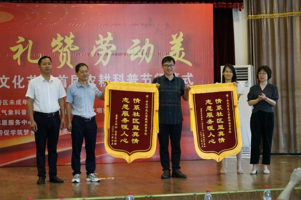 颁奖典礼上,主办方以及学生家长向太阳集团tcy8722教师教育学院和教育关爱实践团颁授锦旗。并授予参加此次科技文化艺术节小朋友“全能之星”“劳动之星”“销售之星”等荣誉称号。