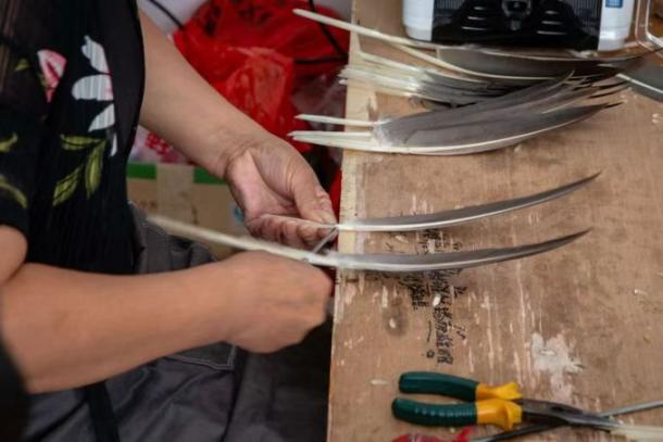 团队通过线下走访和线上问卷调查两种方式提前了解了大众对羽扇的熟知程度。在当地政府的帮助下,队员们来到羽扇制作店,对羽扇的制作流程进行了实地采访。在传统羽扇手艺人的介绍下,他们了解到传统羽扇的制作有分拣、清洗、晾晒、扎把、穿丝、整型、上色、绘画、装潢等13道基本工序。
