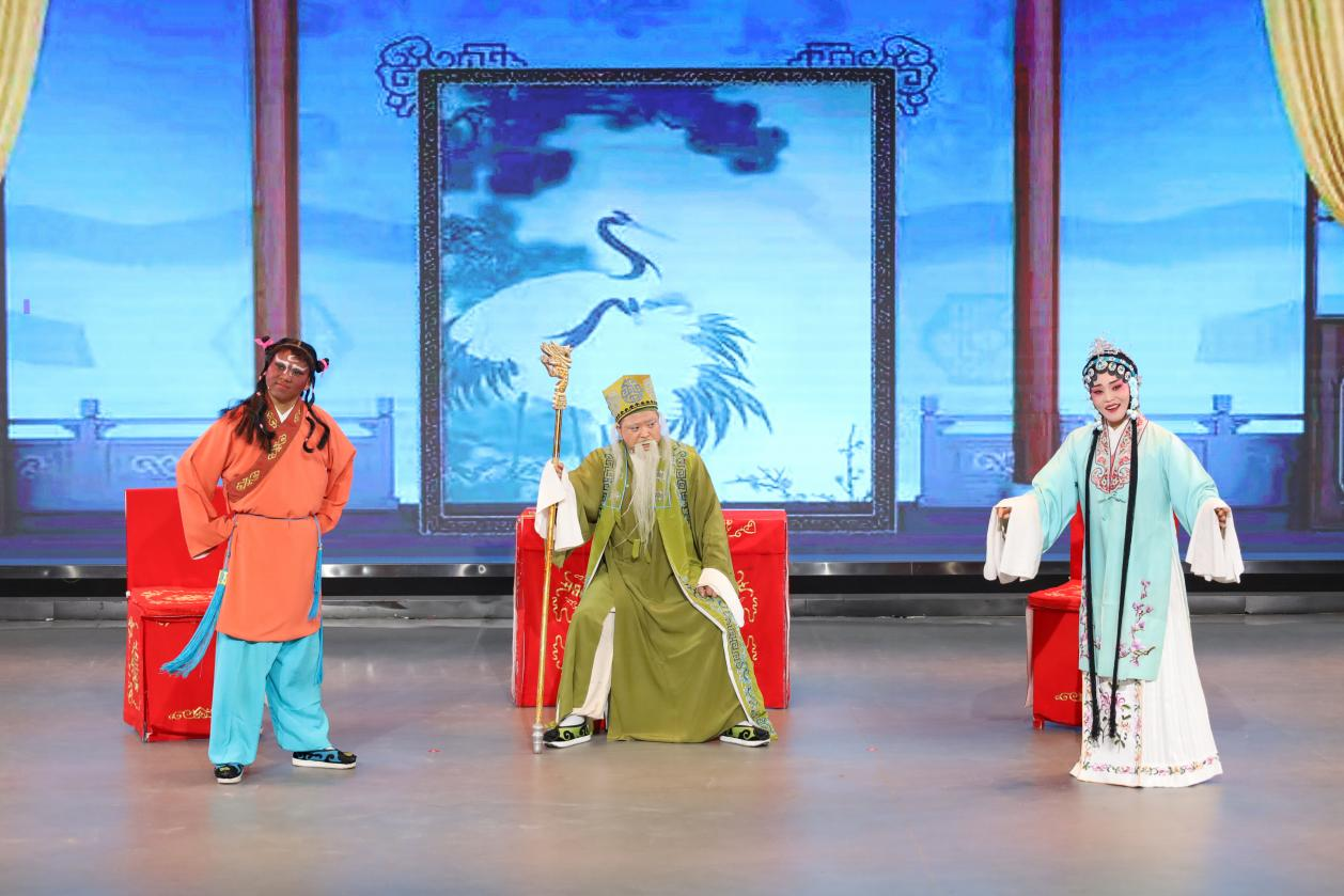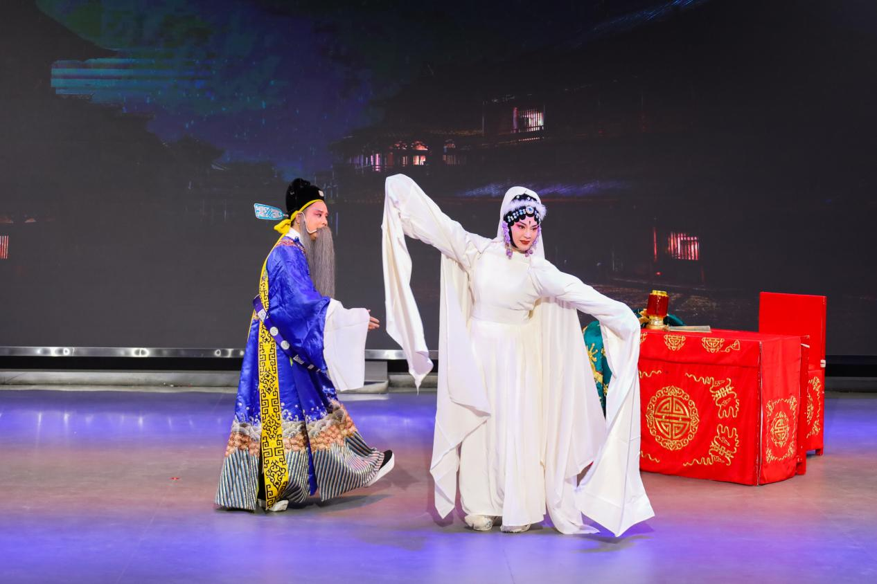 “儿啊,儿啊……这一切竟是南柯一梦?”蓝屏巨幕下,大雪纷飞,窦天章满目怅然,唱腔哀婉;另一旁,身着白衣的窦娥擒着泪兰花指捻,伴随着唱词水袖起舞,朦胧间令人痴醉。戏幕起,戏幕落,台下观众或掩面拭泪,或摄影记录,灯光亮起时掌声雷动。