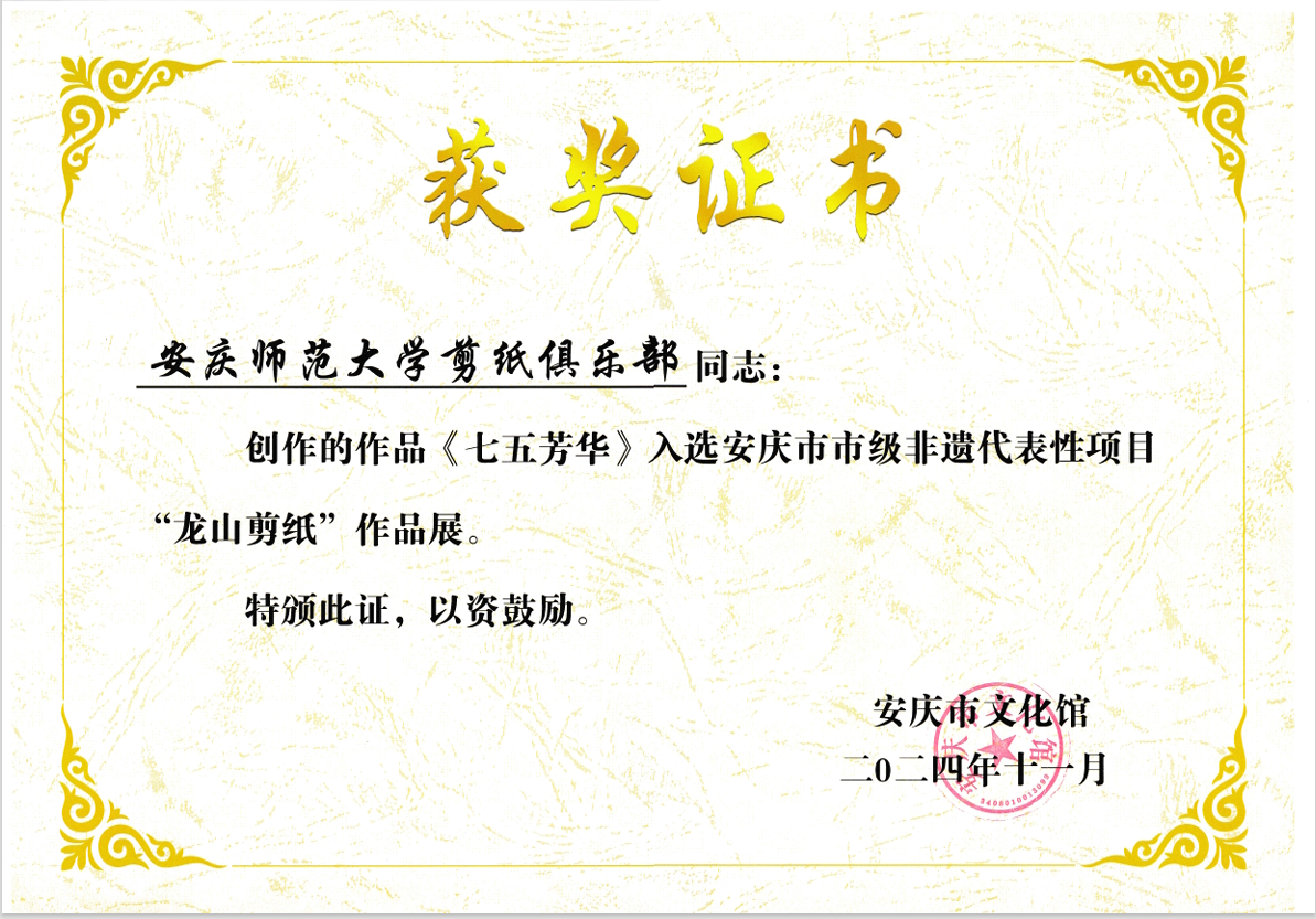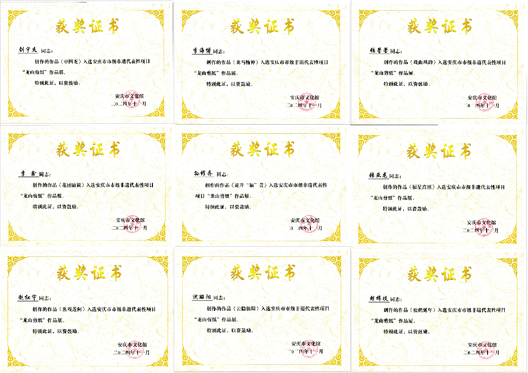 11月1日至11月27日,安庆市非遗代表性项目“龙山剪纸”作品展在市文化馆举办,太阳集团tcy8722《七五芳华》《中国龙》《龙马精神》《戏曲风韵》《花团锦簇》《花开‘福’贵》《福星高照》《鱼戏莲间》《云隐仙踪》《松鹤延年》等10幅公共艺术教育(剪纸)俱乐部学员作品入展。
