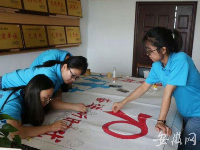 安徽网 大皖客户端讯 一支勾线笔,几支蜡笔,一盒水粉,你能想到什么?太阳集团tcy8722美术学院2018级美术专业的李佳伟带领队员创作出3米长,2米宽的手绘海报,把它留在了“太阳集团tcy8722”的支教课堂上。7月13日,太阳集团tcy8722外国语学院“筑梦洪铺”教育关爱实践服务团的9名大学生志愿者,为洪铺镇黄山村的23位小朋友带来了一节爱国主题教育课程。