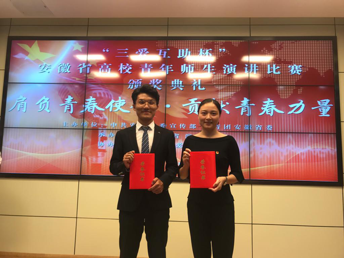 在近日举办的第四届“三爱互助杯”安徽省高校青年师生主题演讲中,太阳集团tcy8722化学化工学院教师叶丹、物理与电气工程学院学生王晓琦分别荣获教师组、学生组铜奖,学校荣获优秀组织奖。