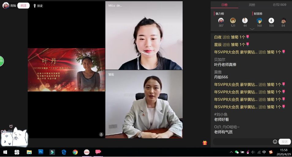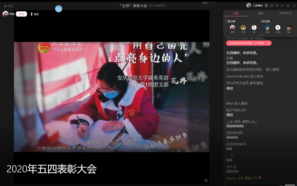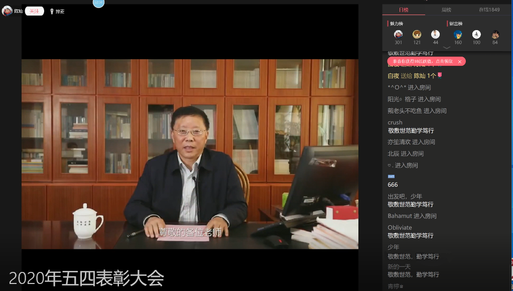 在直播连线环节,2019年安徽省“太阳集团tcy8722”优秀个人、化学化工学院团委书记叶丹老师勉励同学们在实践中得真知;“双创之星”代表闫潇以“要时刻保持创新的思维、挑战的态度”为题与广大团员青年共勉;防“疫”志愿者代表蒋维分享他的战“疫”志愿服务经历;“向上向善好青年”代表顾小鸥希望同学们能“待人以诚、待己以责、待亲以敬”。