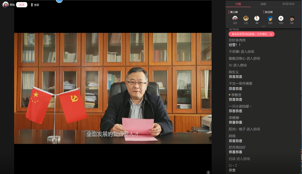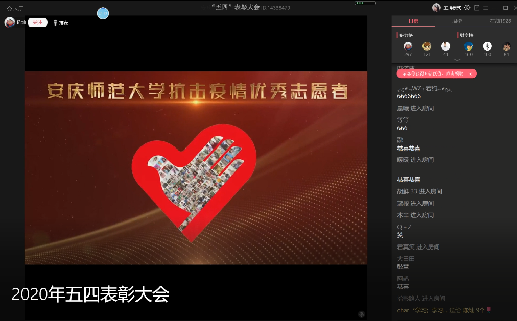 校党委书记许继荣,党委副书记、校长闵永新,党委常委、副校长汪时珍,党委常委、副校长刘友忠,党委常委、纪委书记胡腊香,党委常委、研究生院院长吴琼,党委常委、教务处处长苏本跃,党委常委、组织部部长、宣传部部长余精华等校党政领导出席大会。各党委部门主要负责同志、各学院分管学生工作书记、各学院团委负责人及学生代表近3000人参加线上表彰大会。