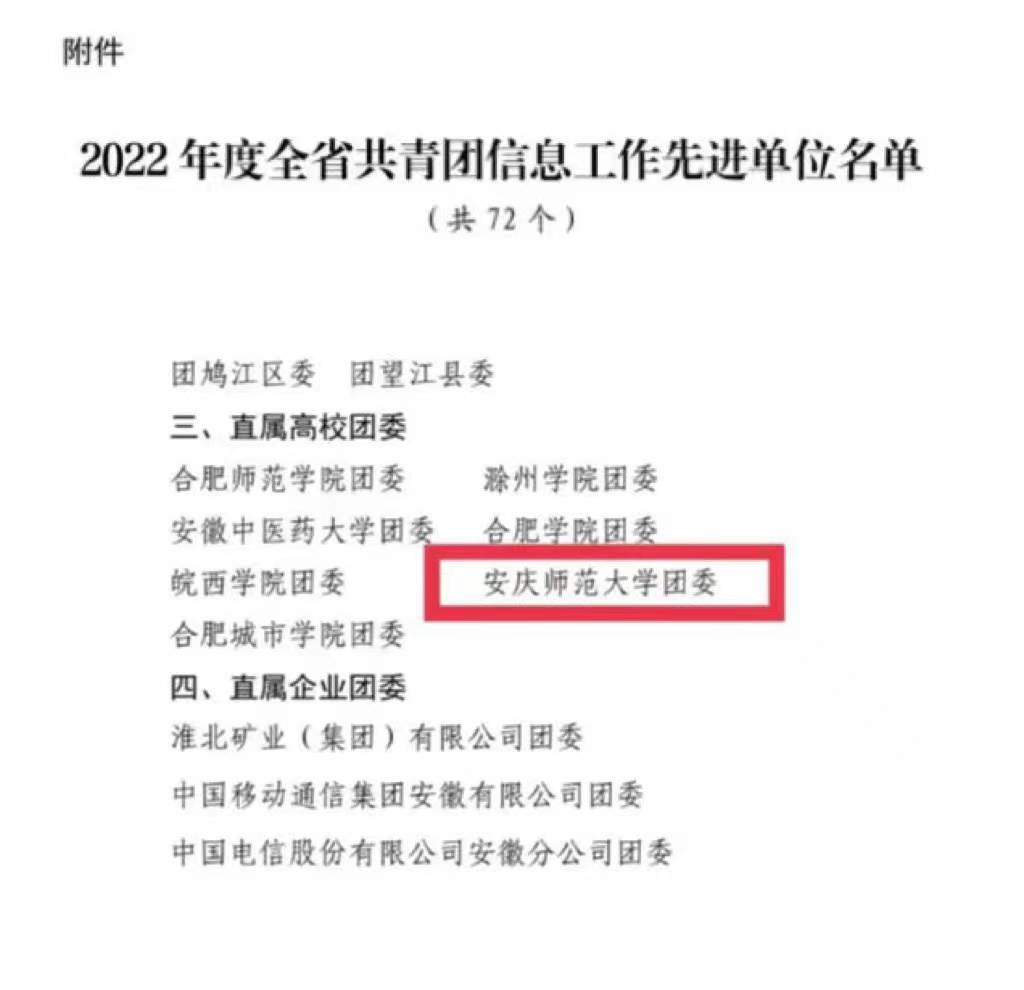 日前,共青团安徽省委对2022年度全省共青团信息工作先进集体进行表彰,校团委荣获“2022年度全省共青团信息工作先进单位”称号,全省仅7所直属高校团委获此称号。