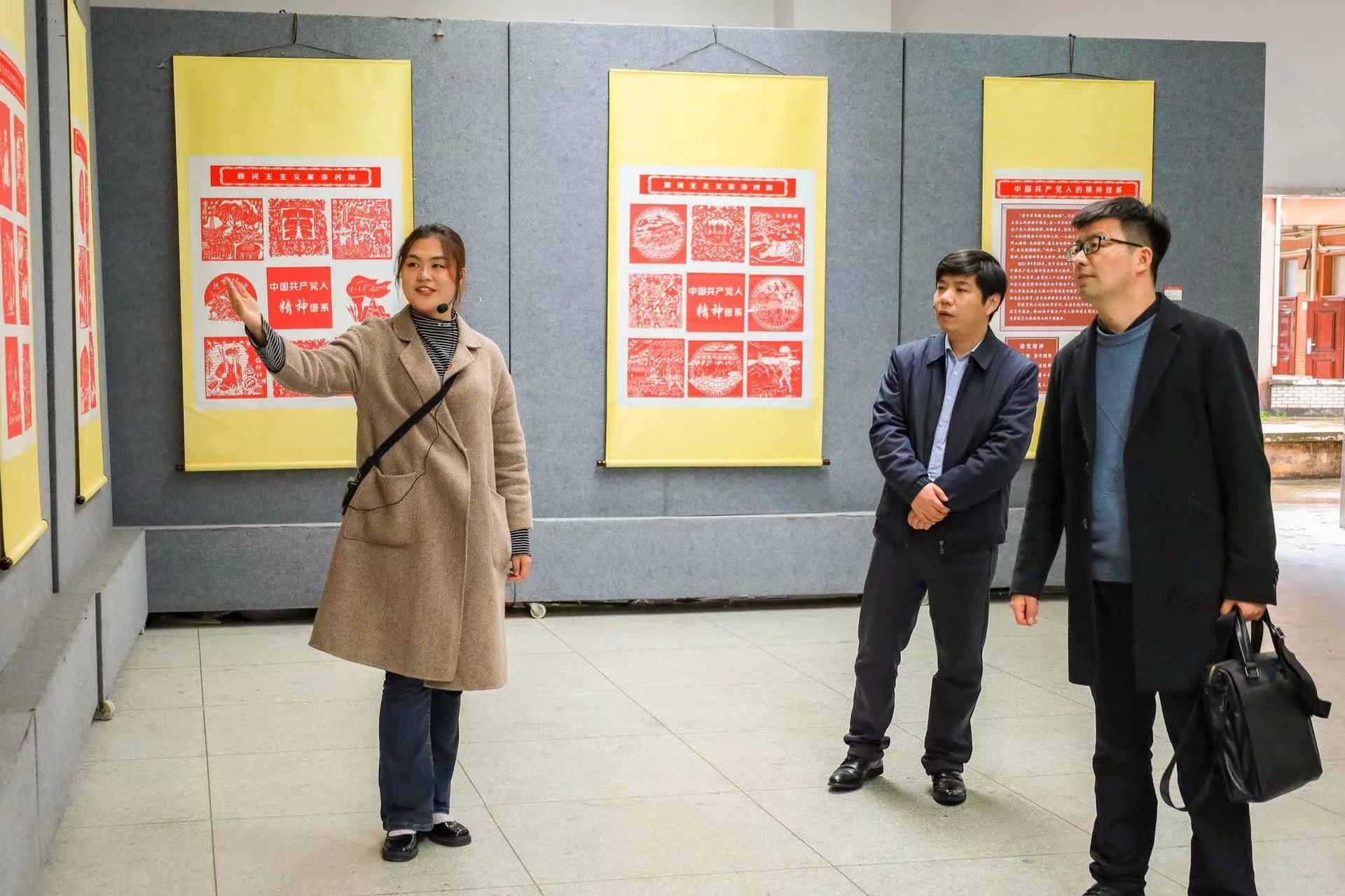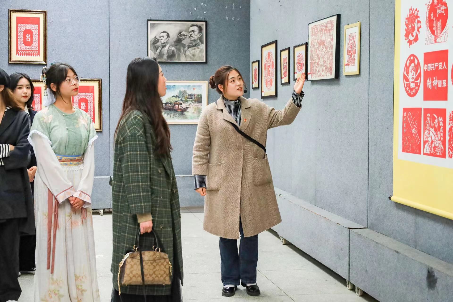 比赛结束后,参赛师生共同参加了“青春向党,艺心逐梦”公共艺术教育成果展暨主题团日活动。本次展出作品涵盖剪纸、书法、扎染、挑花、缠花等多种艺术表现形式,既反映了青春心向党、人民砥砺前行的精神风貌,又展示了安庆地域非物质文化遗产。参展师生穿梭在一件件作品间,或驻足观看,或亲手体验,细细品味着作品的精神内涵。