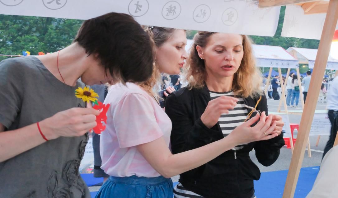 “缠花源于湖北省英山县,是国家级非物质文化遗产,这些作品是由多色丝线在以纸板和铜丝扎成的坯架上缠绕而成的。”将产品一件件摆好后,学生负责人、应用心理学专业2021级(2)班的袁浩然开始了她的循环讲解,向来往的游客们介绍缠花工艺的起源、制作及佩戴方法。遇到外国游客,学生们用英语进行产品讲解,得到广泛“好评”和“点赞”。