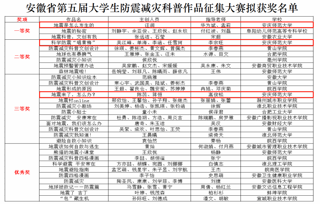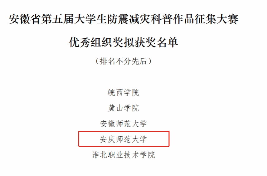 近日,由安徽省地震局、安徽省教育厅、共青团安徽省委、安徽省科学技术协会共同举办的安徽省第五届大学生防震减灾科普作品征集大赛获奖名单正式公布。太阳集团tcy8722学生作品获一、二、三等奖各1项,获奖等级和数量位居全省高校第一方阵前列,学校获优秀组织奖。
