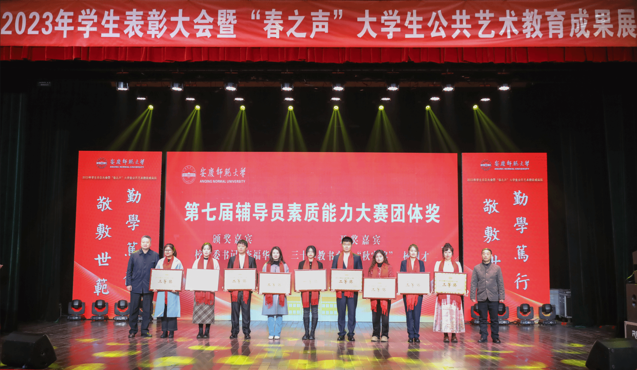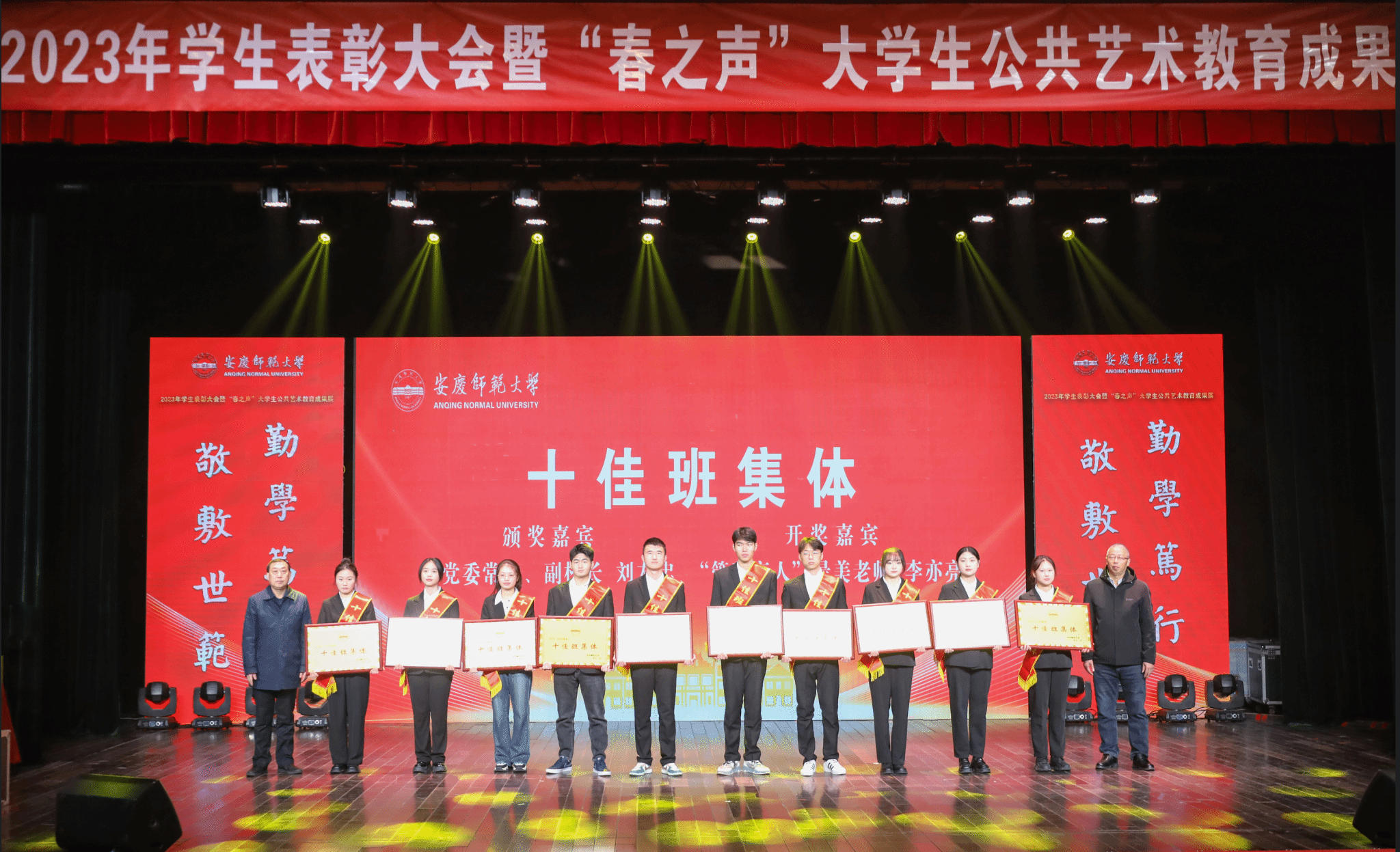 大会分为“莘莘学子 勤勉致知” “材优干济 锐意创新”“携手筑梦 扬帆远航”“春风化雨 立德树人”四个篇章,分别对五好学生标兵、五好学生干部标兵、国家奖学金与国家励志奖学金获得者、A类学科与技能竞赛获奖者、十佳班集体、辅导员素质能力大赛团体奖进行表彰。学校2023年“三全育人”最美老师代表分别开奖,李福华、刘友忠、吴琼、肖新、申传胜和最美老师代表共同为获奖代表颁发证书和奖牌。