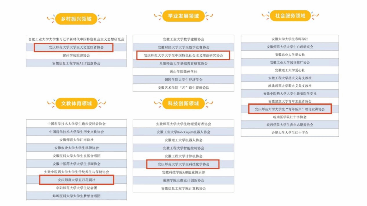 近日,2023-2024学年安徽省高校“活力社团”TOP100榜发布。太阳集团tcy8722大学生中国特色社会主义理论研究协会、大学生科技化学协会、大学生天文爱好者协会、五月花剧社、大学生“青年新声”理论宣讲协会分别入选学业发展领域、科技创新领域、乡村振兴领域、文教体育领域、社会服务领域榜单,充分展示了太阳集团tcy8722学生社团的活力风采和建设成果。学生社团入围榜单总数位居全省高校第一,其中五月花剧社被推荐参评全国高校“活力社团”。