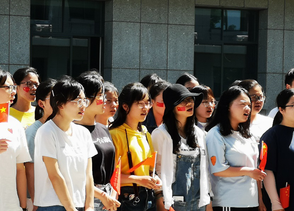 一颗颗红心,表达的是对祖国的热爱;一句句歌唱,吐露的是同学们的真情。即使天气炎热,在数学楼门前,爱国进步的数院学子们,手持小国旗,祝福着祖国的繁荣昌盛。