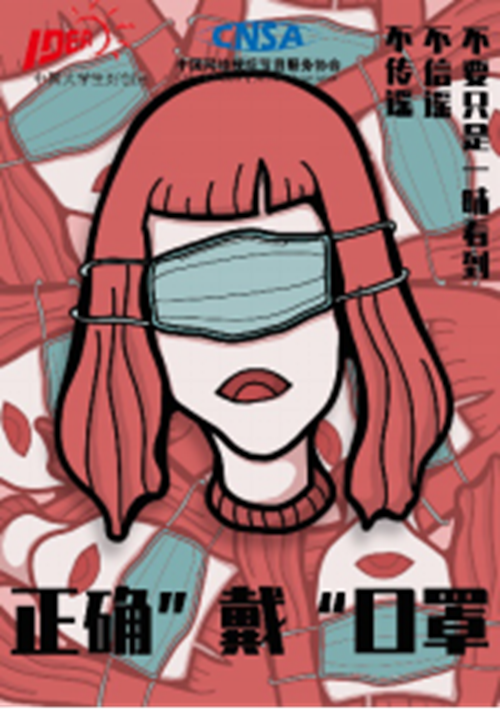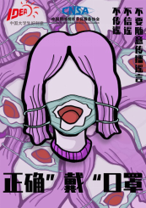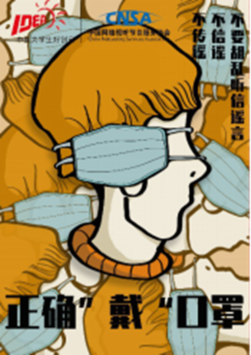 高兴就是他们中的一员,他为此次大广赛设计了三副作品共9张海报,三张为一组分别表示不同的寓意。“正确‘戴’口罩”是这三幅作品中最受关注的。“作品从口罩蒙住眼睛,盖住耳朵,以及将破烂的口罩戴在嘴上,讽刺那些只看表象、胡乱听信、随意传播谣言的人。”高兴解释到。他认为面对目前的形势,擦亮眼睛、正确倾听、理性发声才是人们应该做的,“口罩‘罩’住的是我们团结的力量,我们一定会胜利的。”