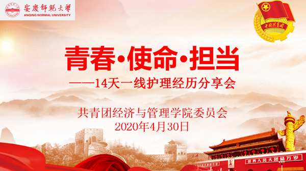 4月30日晚,经济与管理学院举办“青春˙使命˙担当”系列报告会——“我的战‘疫’经历”线上直播分享会,邀请了安庆市立医院护师查玭玭作为主讲人,和同学们分享了她参加救治护理新冠肺炎患者的战‘疫’经历。经济与管理学院300余名师生线上观看了直播分享会。分享会由学院党委副书记周毅主持。