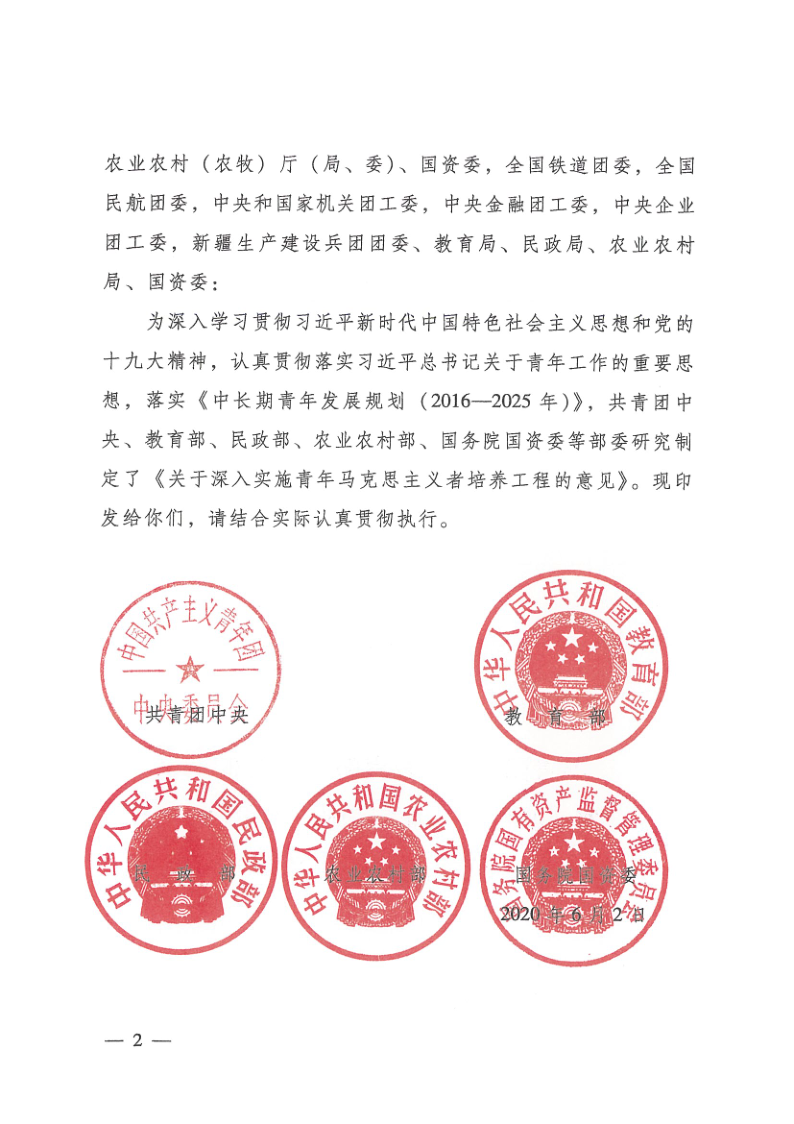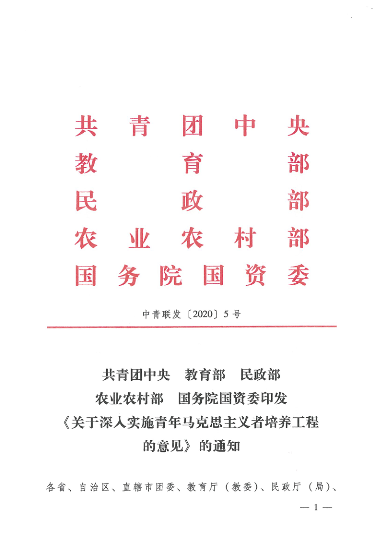 共青团中央、教育部、民政部、农业农村部、国务院国资委印发《关于深入实施青年马克思主义者培养工程的意见》的通知